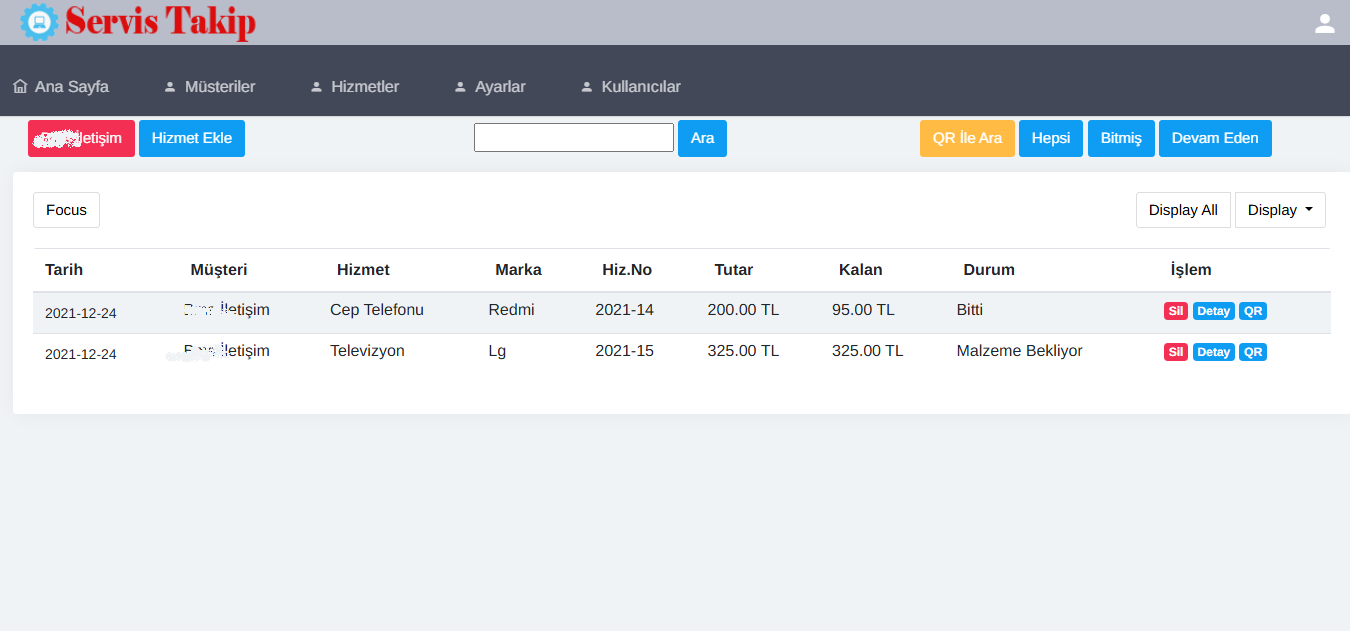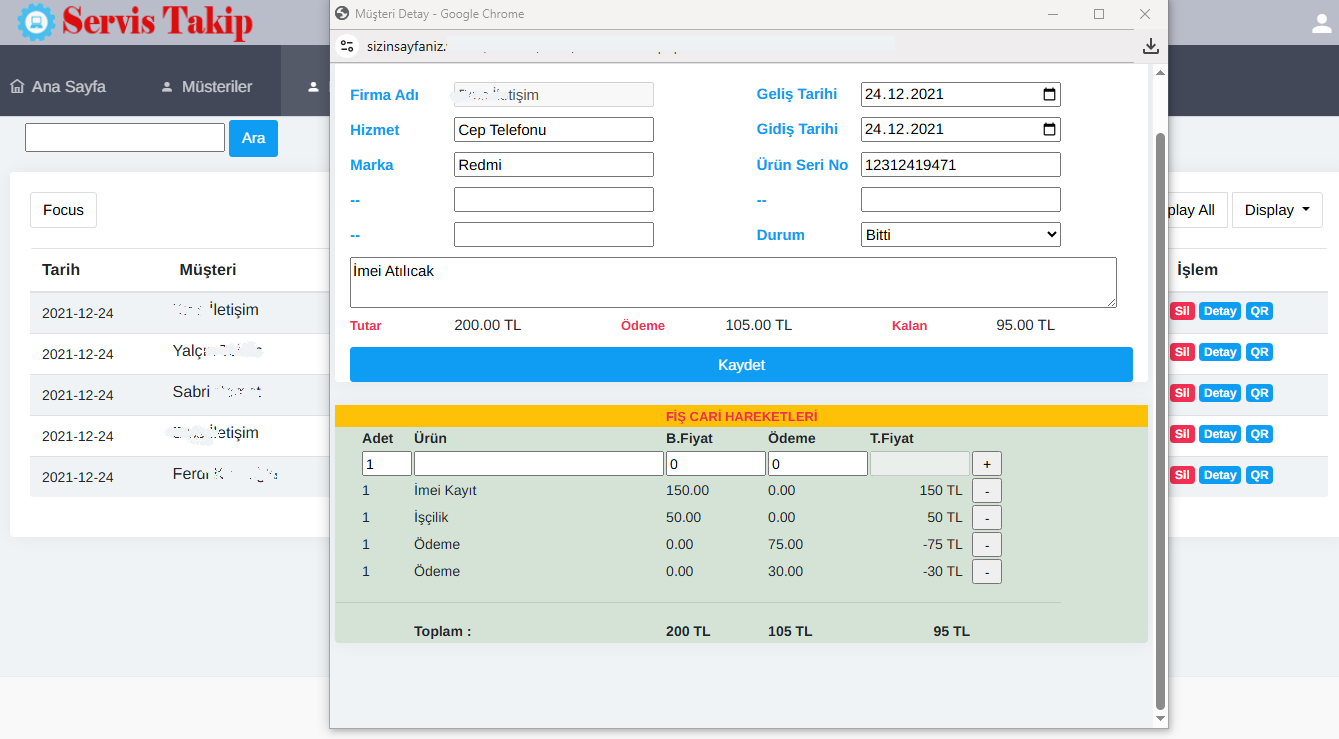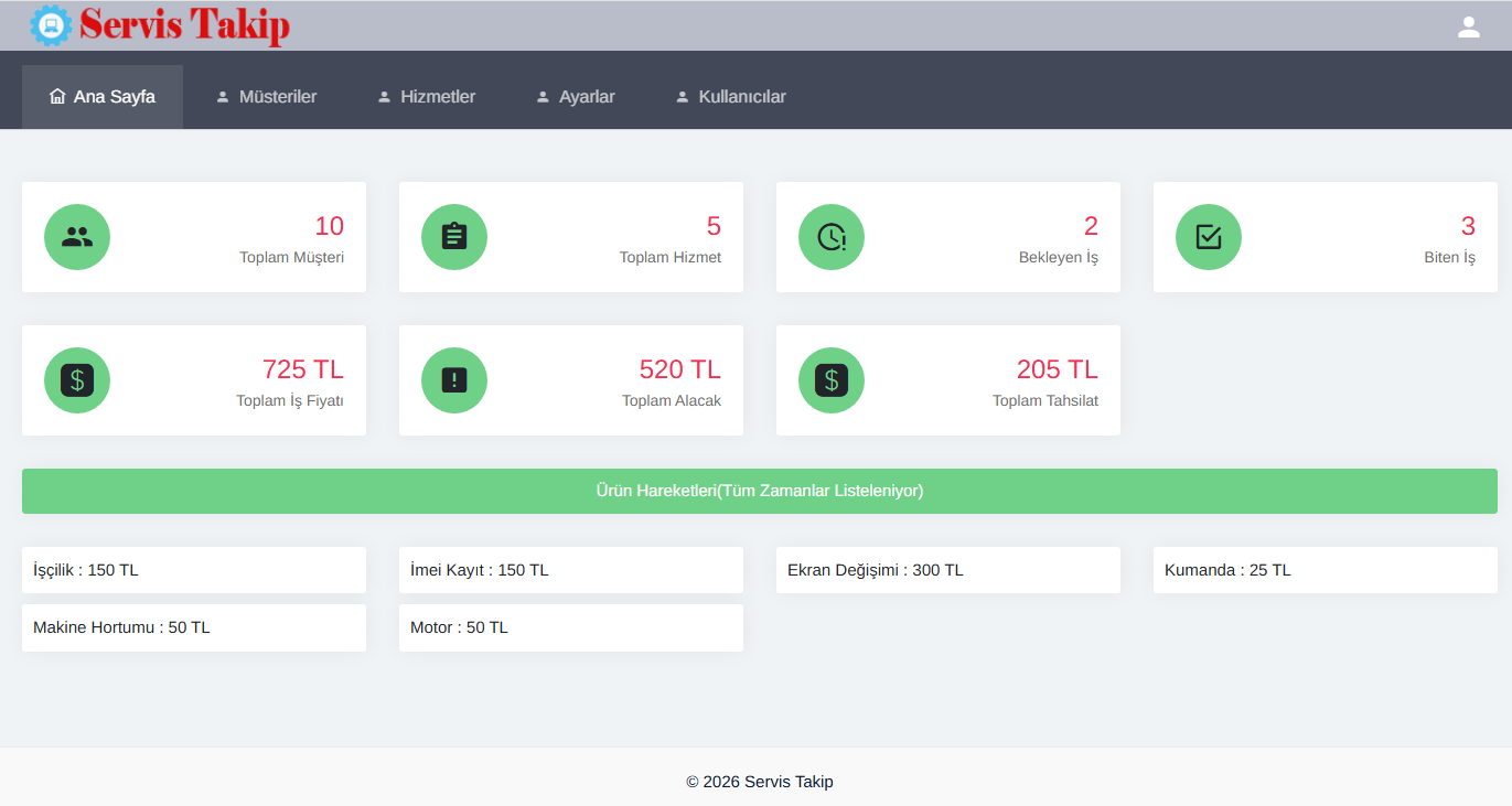 Tamir veya hizmet sektörleri için kolay kullanımlı bir iş & Servis takip uygulaması, Müşterilerinize verdiğiniz hizmetleri, yaptığınız ürün tamirlerini, Tamire geliş ve çıkış tarihlerini, ödemelerini tamir veya hizmet için harcama detaylarını girerek geriye dönük takip edebiliceğiniz, Ürünlere seri no veya hizmetlere fiş numarasını Qr kodlu birşekilde yazdırıp telefonunuzun kamerasında Qr kodu ile taratıp bulabileceğiniz, işlerinizdeki karışıklıkları ve unutulmaların önüne geçebilicek online bir tamir servis takip uygulaması.