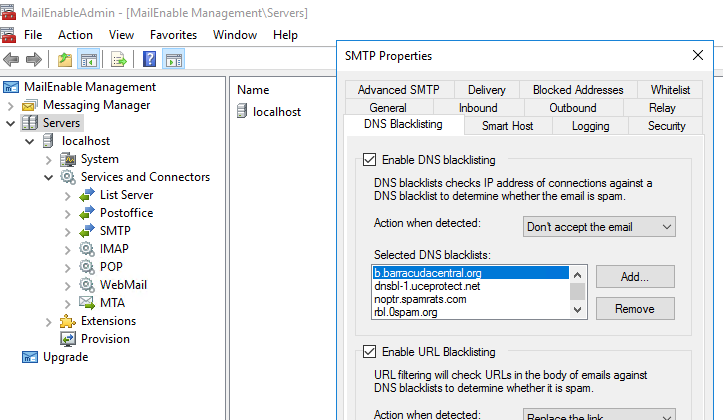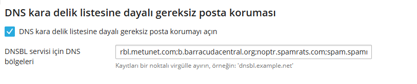 Plesk panelinizde posta sunucusu ayarlarında üstte bulunan alana kullanmak istediğiniz dnbl sunucularının adreslerini girebilirsiniz. eğer plesk kullanmadan sadece mail enable kullanıyorsanız yine aynı işlemi mail enable managametn uygulamasında da yapabilirsiniz.