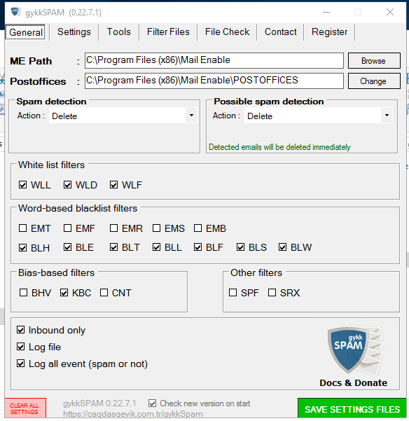 GykkSpam uygulamasında çalışmasını istediğiniz filtreleme seçeneklerini kendinize göre ayarlayabilirsiniz. hangi filtrelemelerin çalışmasını istiyorsanız işaretleyip kaydetmeniz ve filtre dosyalarına filtrelenmesini istediğiniz içerikleri girmeniz yeterli.
