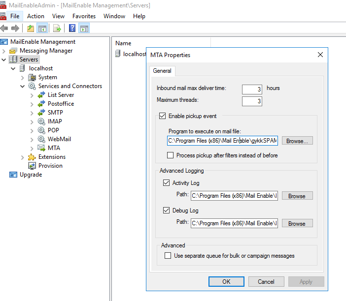 - Mail enable managament uygulamasından Mta kısmında Enable Pickup Event kısmına gykkSpam uygulamasını tanımlıyorsunuz C:\Program Files (x86)\Mail Enable\gykkSPAM\MTA.exe burda dikkat etmeniz gereken bir nokta virüs taraması fazla ram ve cpu tüketeceği için gykkspam uygulama ayarlarında eşzamanlı işlem sınırına 3-4-5 gibi sunucu kaynağınıza göre bir değer girmek aşırı yüklenmeyi azaltacaktır.