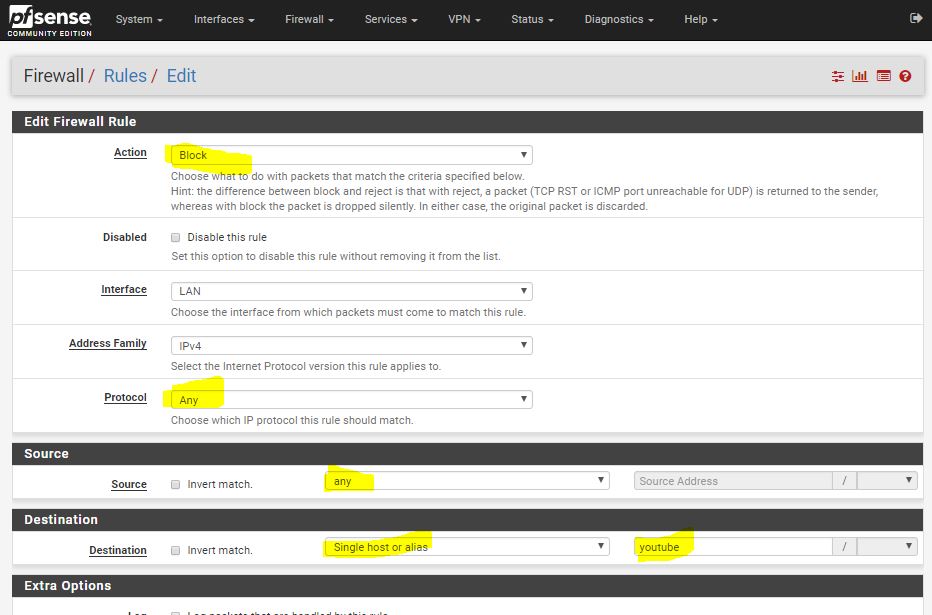 Firewall / Rules / LAN kısmına yeni kural ekleyip Action Block seçip Protocol Any Destination Single host or alias seçip son kutucuğa eklediğiniz alias adını yazarak yasaklama işlemini yapmış olursunuz.