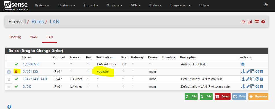 Firewall / Rules / LAN kısmında eklediğiniz kural en üstteki klitlenme kuralının hemen altında olmalıdır, veya bazı kişilerin yasak adreslere girmesine izin vericekseniz tanımladığınız izin kurallarının hemen altında olmalıdır.