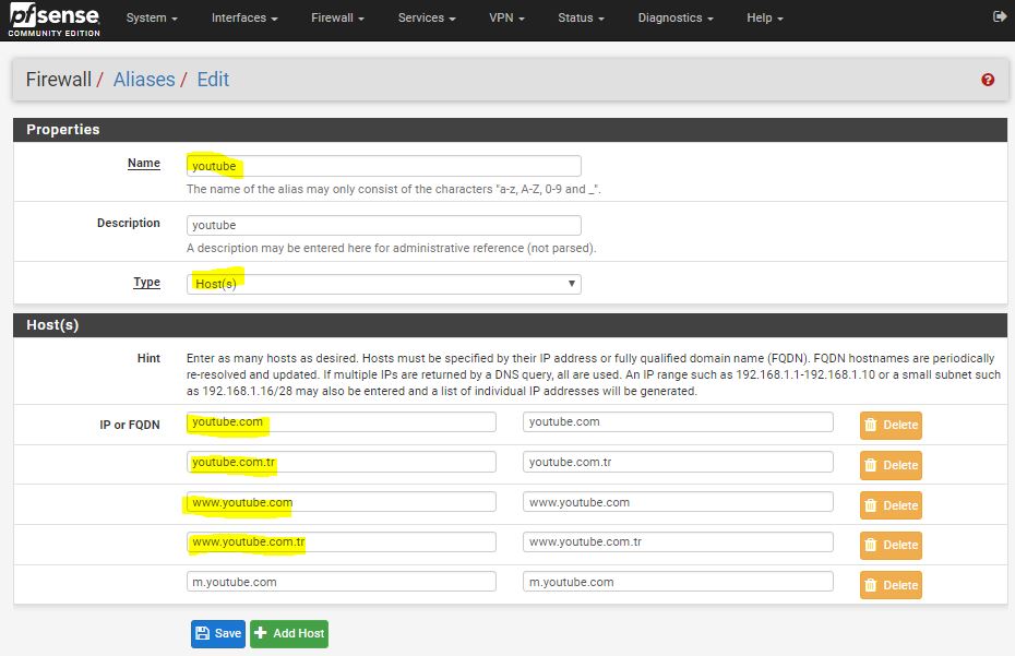 Pfsense 2.4.3 sürümünde https siteeri youtube facebook vs engellemeleri siteler https olduğu için Squid ile yapamadığımızdan dolayı alttaki şekilde istediğiniz https siteleri engelleyebilirsiniz.