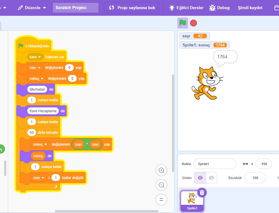 Scratch ile 1 den 50 ye kadar sayıların otomatik karesini hesaplama